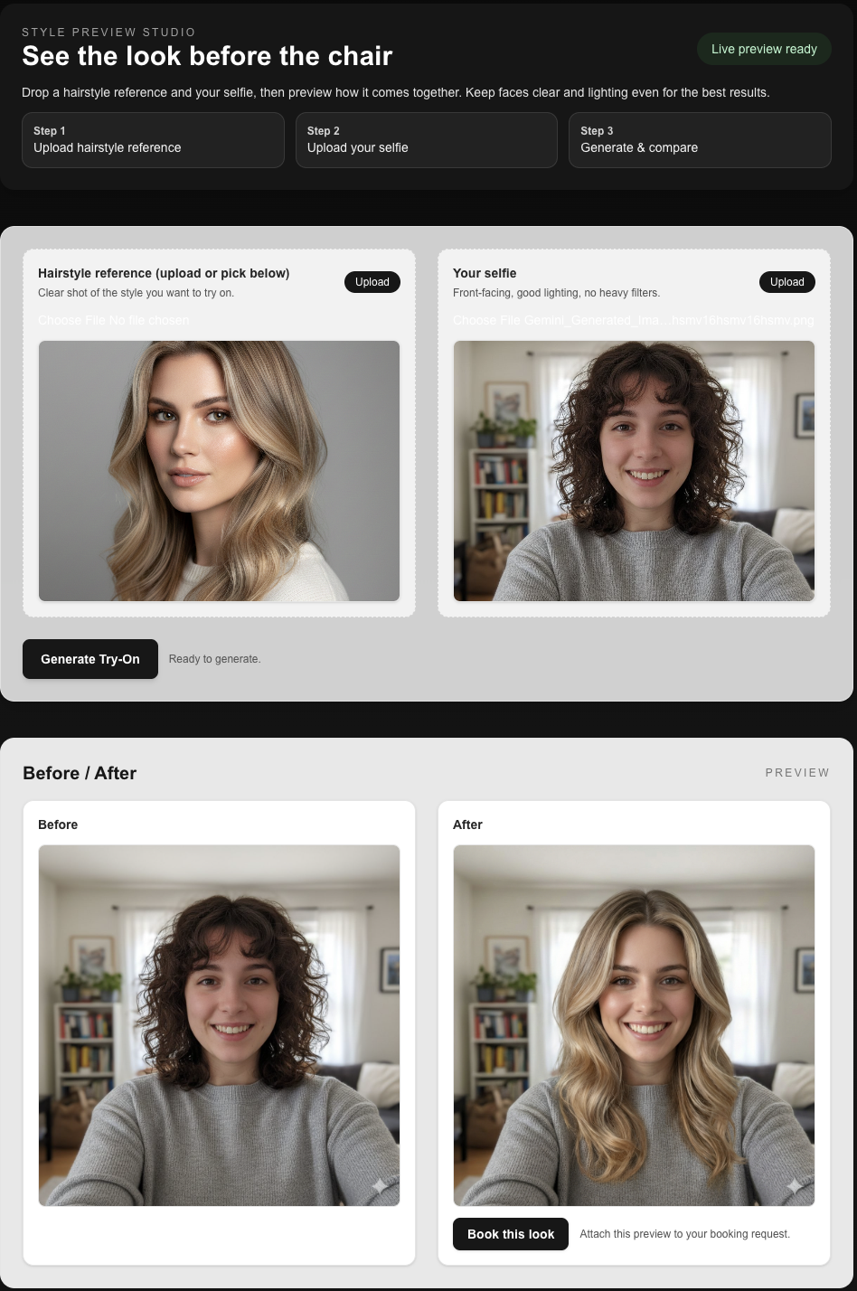 Upload your inspiration or pick one of ours, add your selfie, and get a realistic preview in seconds. Fewer surprises, faster bookings, happier appointments.